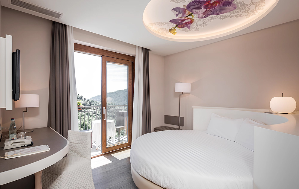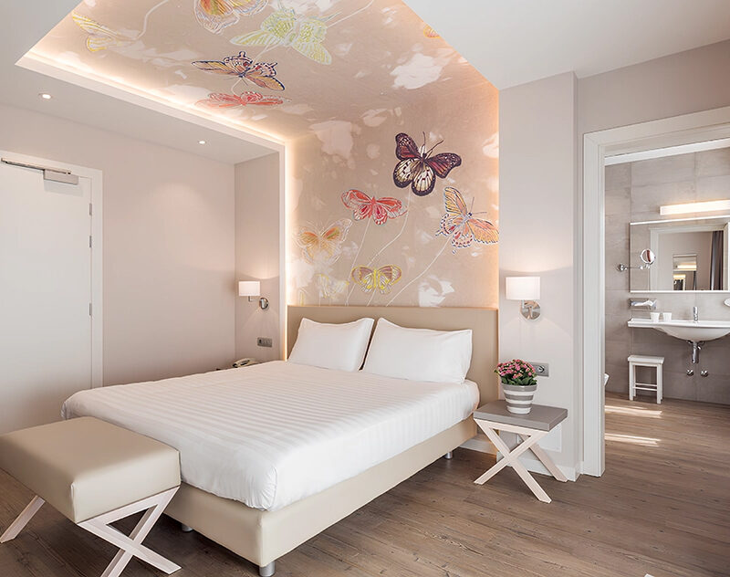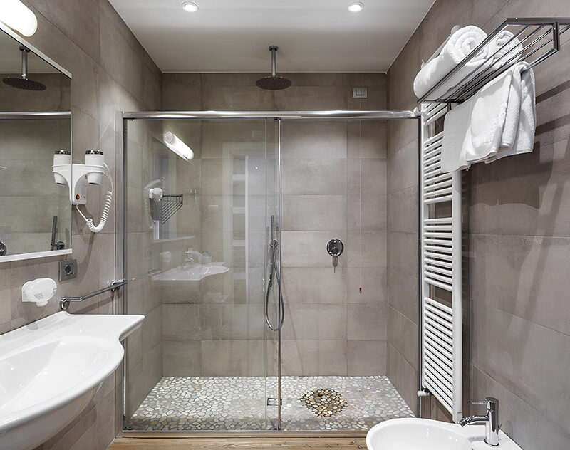 A re-style intervention for a hotel located in a charming setting, focusing on upholstered furniture and glass shower walls. An update that enhanced the space while preserving its original charm, adding a touch of elegance and functionality.